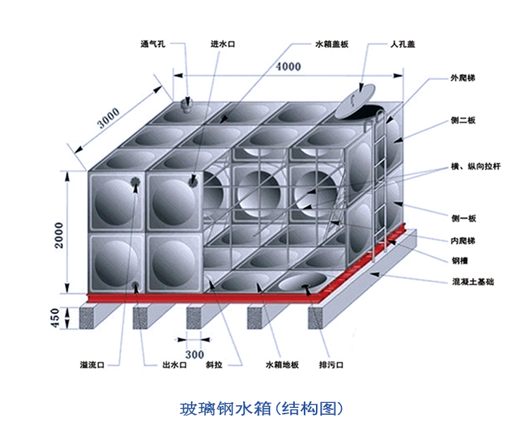 模壓板塊、密封材料、金屬結構件及配管系統現場組裝而成。一般水箱按標準設計,特殊水箱需要專門設計。可根據用戶需要組裝